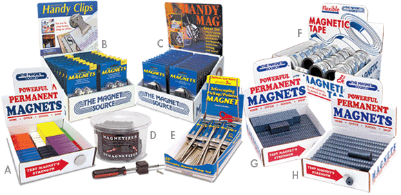 Eye-catching counter and floor displays with our most popular magnets will generate fast and easy sales! A. Part No. 07278DSP Hold Everything Magnets counter display, 56 magnets in eight colors, individually UPC labeled B. Part No. 07219DSP 18-pc. Handy Clips counter display C. Part No. 07221DSP 24-pc. Handy Mag counter display D. Part No. 07224BIN 35-pc. Screwdriver Magnetizer/Demagnetizer Display E. Part No. 07228DSP 12-pc. Pickup/Pointers counter display F. Part No. MDZG1025AB Flexible Magnetic Tape display, 144 bulk coils, each with UPC label G. Part No. MDCB40CB3 Blocks Display contains 300 ceramic blocks, 3/16 thk. x 3/4 wide x 1 long with 3/16 center hole, and 200 solid blocks, 3/16 thk. x 1/4 wide x 7/8 long H. Part No. MDCD10CR75 Discs and Rings Display contains 300 ceramic disc magnets, 3/4 dia. x 3/16 thk., and 200 ceramic ring magnets, 3/4 outer dia. x 1/4 inner dia. x 1/4 thk. |